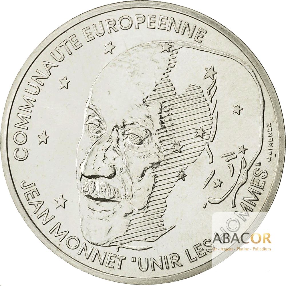 Avers : « COMMUNAUTE EUROPEENNE / JEAN MONNET UNIR LES HOMMES » – Effigie de trois-quart à gauche de Jean Monnet dessinée au trait, les douze étoiles de la Communauté Européenne en fond, signé J. JIMENEZ derrière la tête.