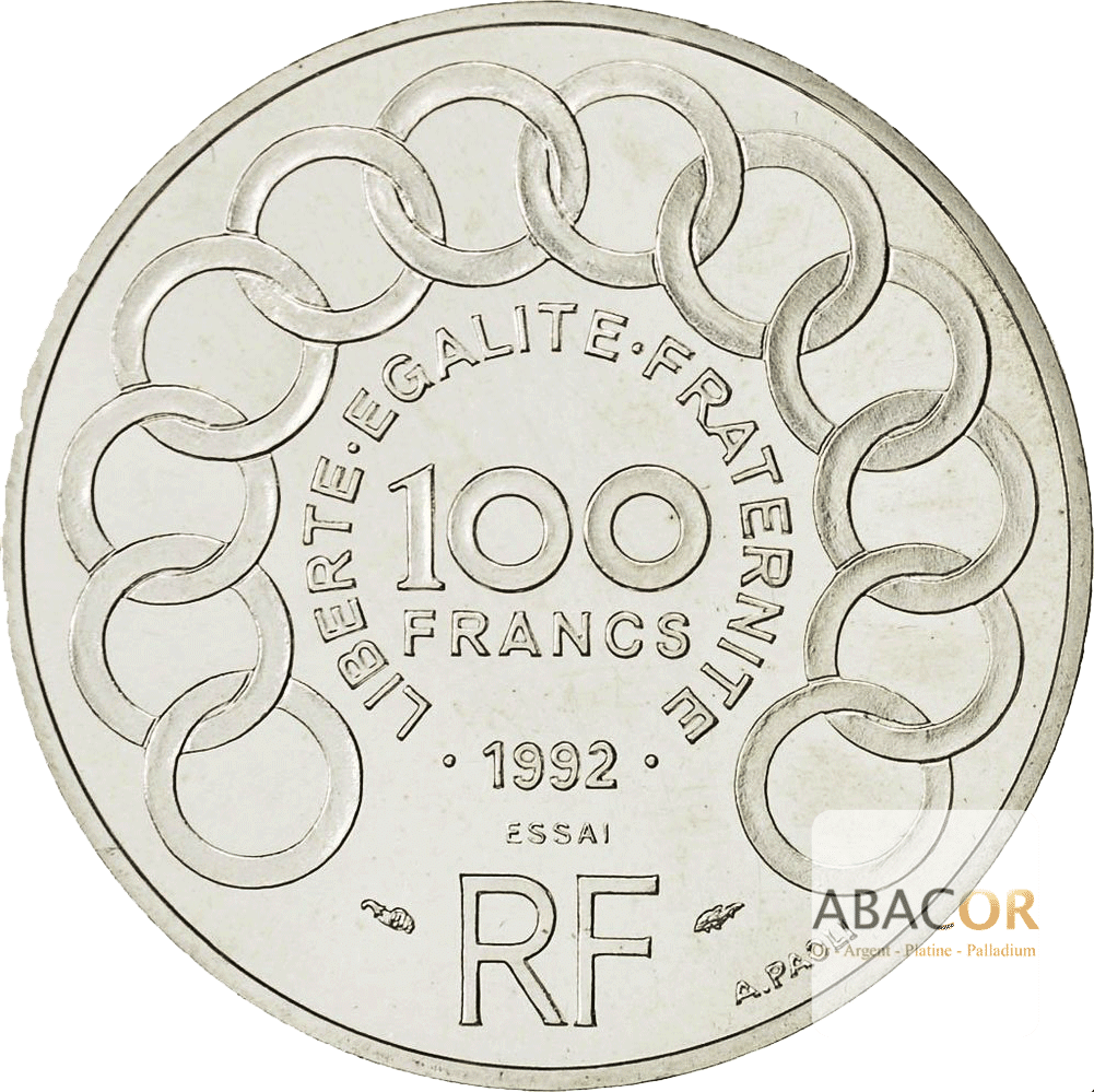Revers : « LIBERTE EGALITE FRATERNITE / 100 FRANCS / 1992 » Légende circulaire dans 12 anneaux entrelacés ; signé A. PAOLI à 5 heures le long du listel.
