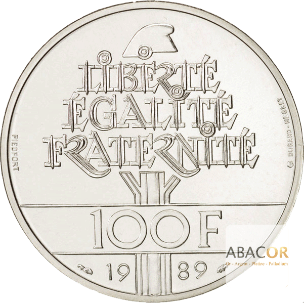 Revers : « LIBERTE EGALITE FRATERNITE » « 100 F » « 1989 » Arbre de la Liberté dont les branches sont faites de la triade républicaine surmontée d’un bonnet phrygien ; signature DURAND MEGRET à droite le long du listel.