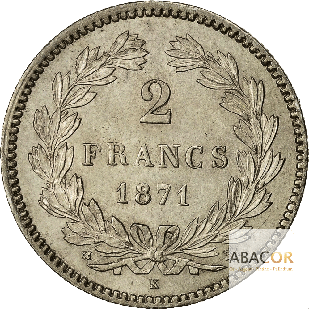 Ce type de 2 Francs Argent Cérès Sans Légende fut fabriqué en urgence car non seulement la période est troublée par les suites de la guerre de 1870 et la Commune mais encore, la chute de Napoléon lll n’ayant pas été « prévue », rien n’était disponible pour produire des monnaies « républicaines ». On n’était d’ailleurs même pas certain du régime politique à venir puisqu’une restauration monarchique était largement envisagée, n’hésitant qu’entre le comte de Paris pour les Orléanistes et le comte de Chambord pour les Légitimistes. Ce n’est qu’en 1873 que le refus du comte de Chambord d’accepter le drapeau tricolore fera définitivement échouer une troisième restauration. Ce type monétaire a donc été fabriqué avec le droit des 2 francs de la Deuxième République et un revers hérité des 2 francs de Louis-Philippe.
