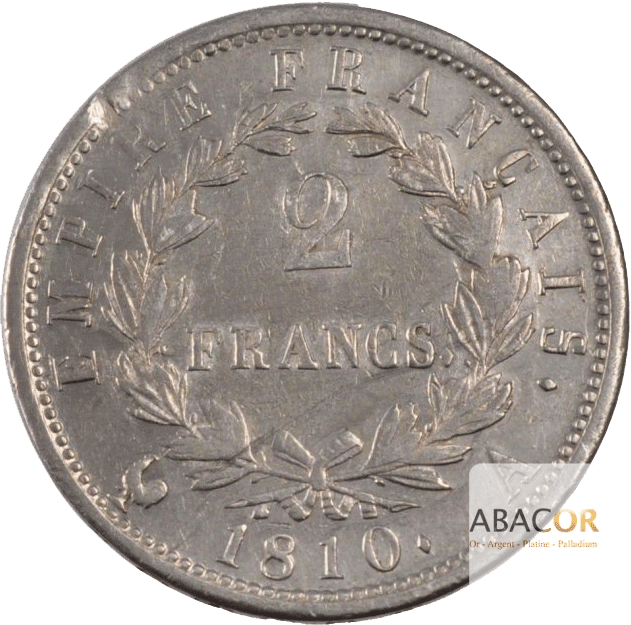 Revers : « EMPIRE FRANÇAIS » – « 2 FRANCS » en deux lignes, dans une couronne composée de deux branches de laurier, nouées à leur base par un ruban.