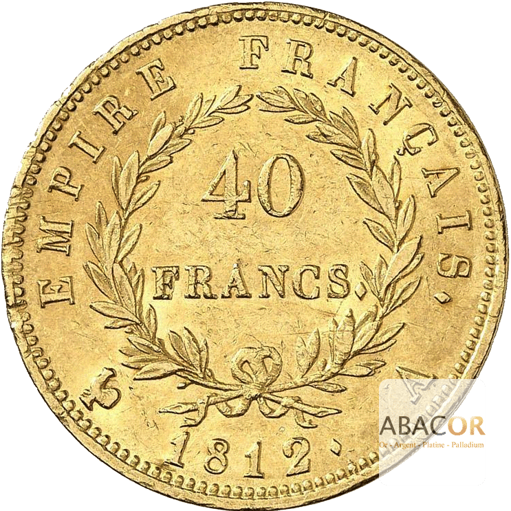 Revers : « EMPIRE FRANÇAIS » – « 40 FRANCS » dans une couronne formée de deux branches due laurier nouées à leur base, millésime suivi d’un petit losange antre différent et lettre d’atelier, le long du listel sous la couronne.