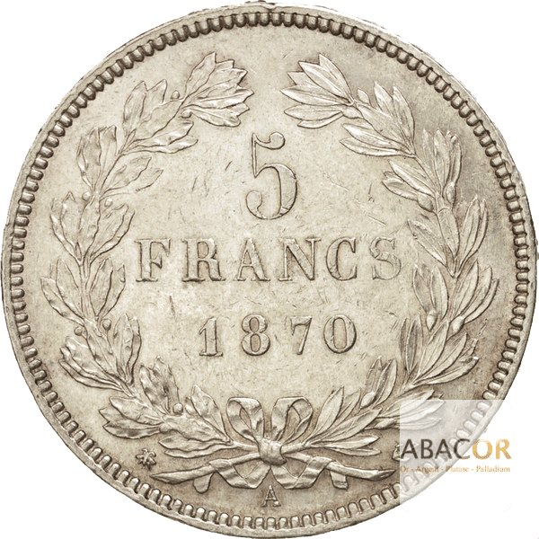 Revers : « 5 FRANCS » en deux lignes dans le champs, au-dessus du millésime, dans une couronne nouée par un ruban à sa base, formée à gauche d’une branche de laurier, à droite d’une branche d’olivier ; sous le noeud, la lettre d’atelier encadrée des différents.