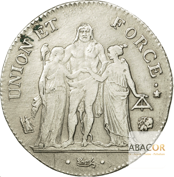 L‘Union et Force, première pièce d’argent exprimée en francs, est une pièce charnière dans l’histoire de la numismatique française. En effet, elle prend la succession de l’écu royal de six livres, par le truchement des écus conventionnels et constitutionnels républicains et en respecte aussi précisément que possible les caractérisques (frai observé inclus !) mais dans une faciale qui intègre la pièce dans la logique du système métrique. Cet avantage lui permettra de s’insérer sans difficulté dans le système du Franc Germinal qui vena le jour en germinal An XI.