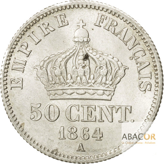Revers : Titulature : EMPIRE FRANCAIS. Description: 50 CENT au-dessus du millésime et de la lettre d’atelier, sous une couronne impériale d’aigles supportant un globe crucigère.