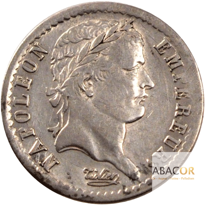Avers : Titulature : NAPOLEON EMPEREUR. Description: Tête laurée de Napoléon Ier à droite, un ruban descendant derrière la nuque ; au-dessous Tiolier en cursif.