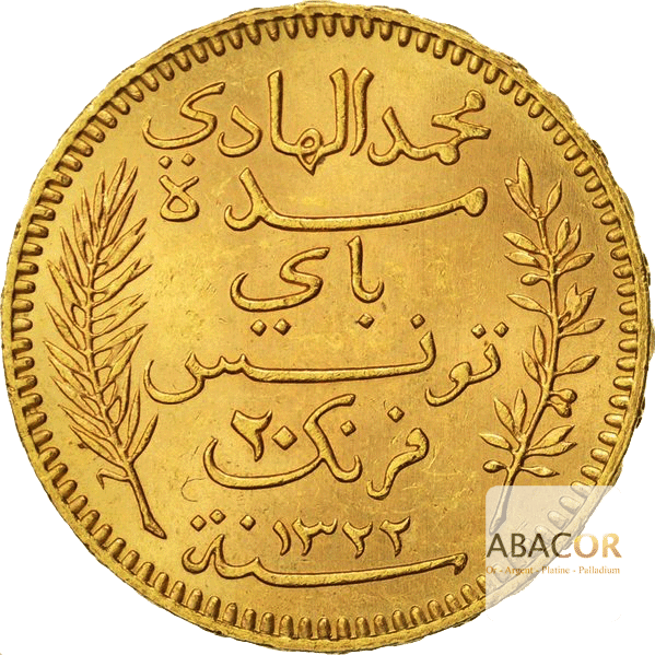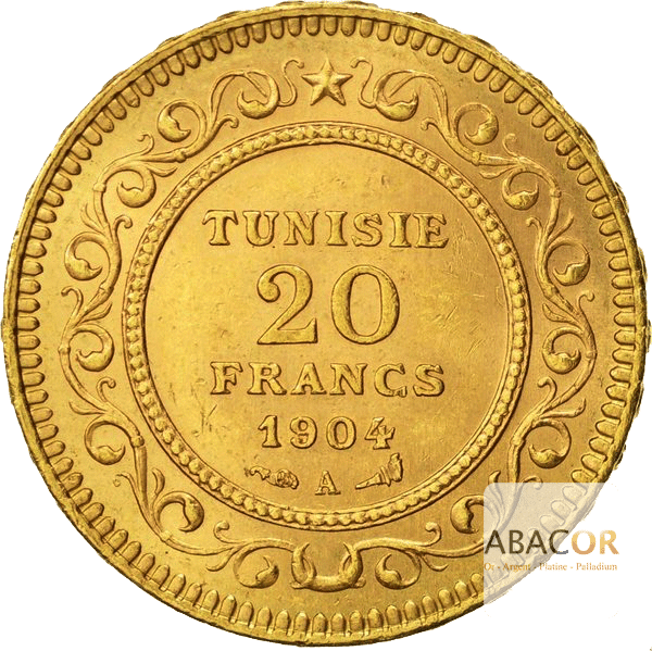 Dix ans après l’instauration du protectorat français en Tunisie, la piastre tunisienne, également appelée rial tunisien, est remplacée par le Franc tunisien. La pièce de 20 Francs Tunisie est frappée entre 1891 et 1928 et a les mêmes caractéristiques de poids, de taille et le même titre que la pièce de 20 Francs Or émise pendant la IIIe République en France. Le Franc tunisien disparaitra en 1958 au profit du dinar tunisien après l’abolition du protectorat.