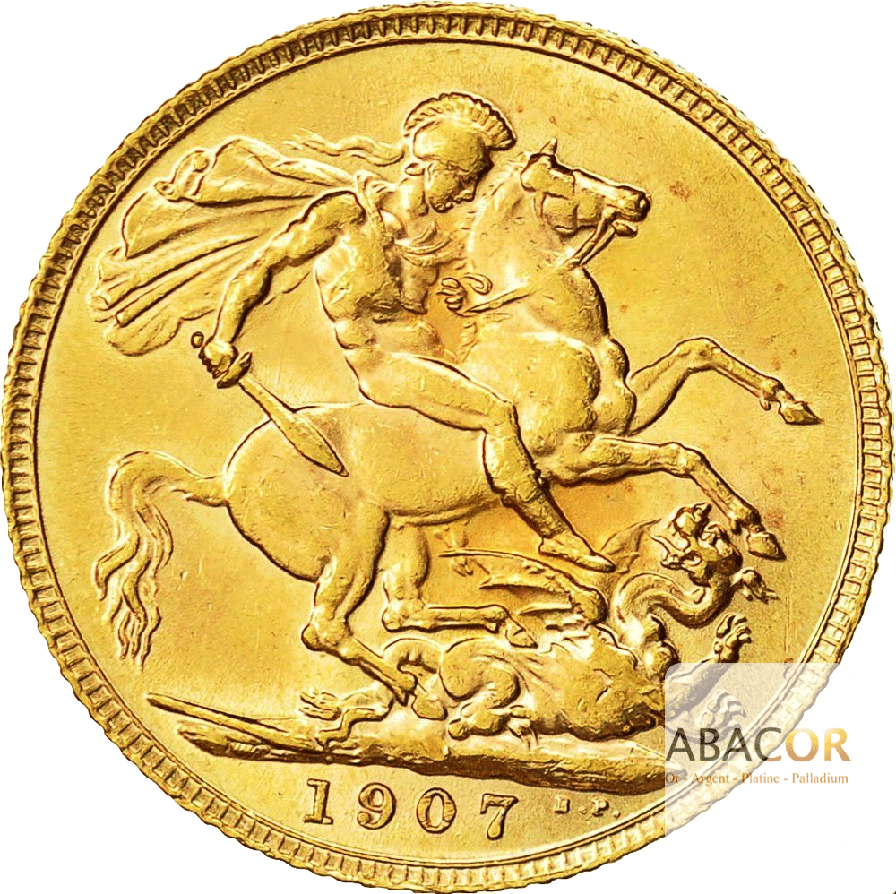 La titulature d’Édouard VII est placée sur la bordure de l’avers de la pièce de Souverain « Edouard VII ». Il s’agit de l’abréviation d’« Edwardus Dei Gratia Britanniarum Omnium Rex Fidei Defensor Indiae Imperator ». On peut la traduire par « Édouard VII, par la grâce de Dieu, roi de toutes les Bretagnes, défenseur de la foi, empereur des Indes ». Le régent britannique est effectivement empereur des Indes depuis 1876. Au revers, on aperçoit Saint George, portant un casque romain, une cape et une épée, est représenté à cheval, terrassant un dragon. L’année de frappe et un poinçon figurent en dessous de l’illustration. Aucune autre mention n’est présente.